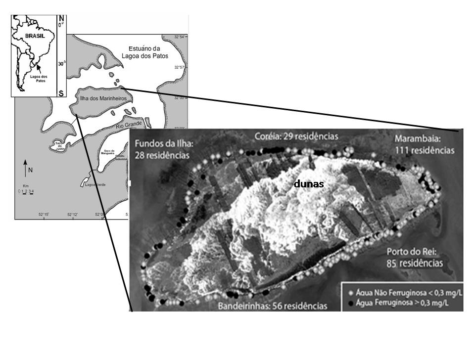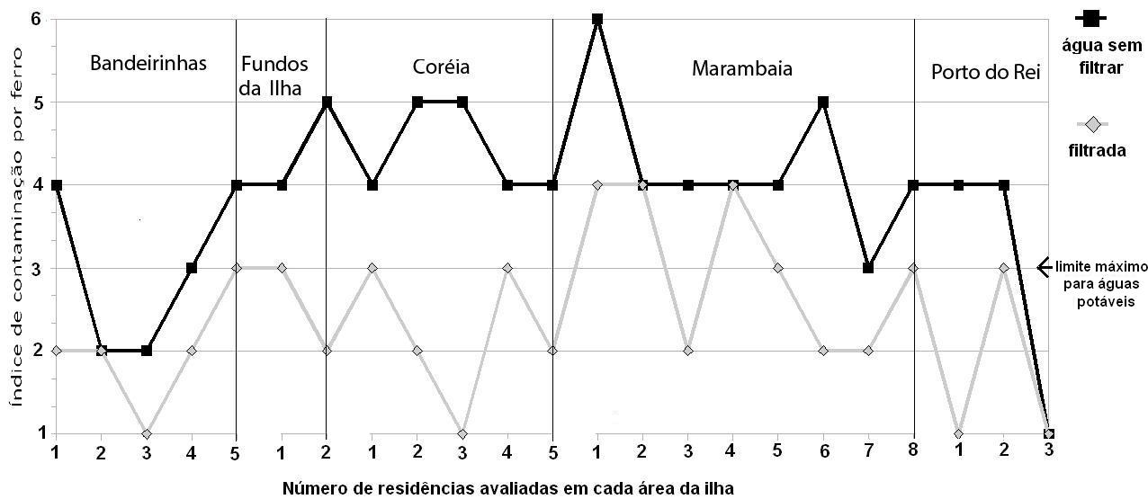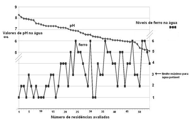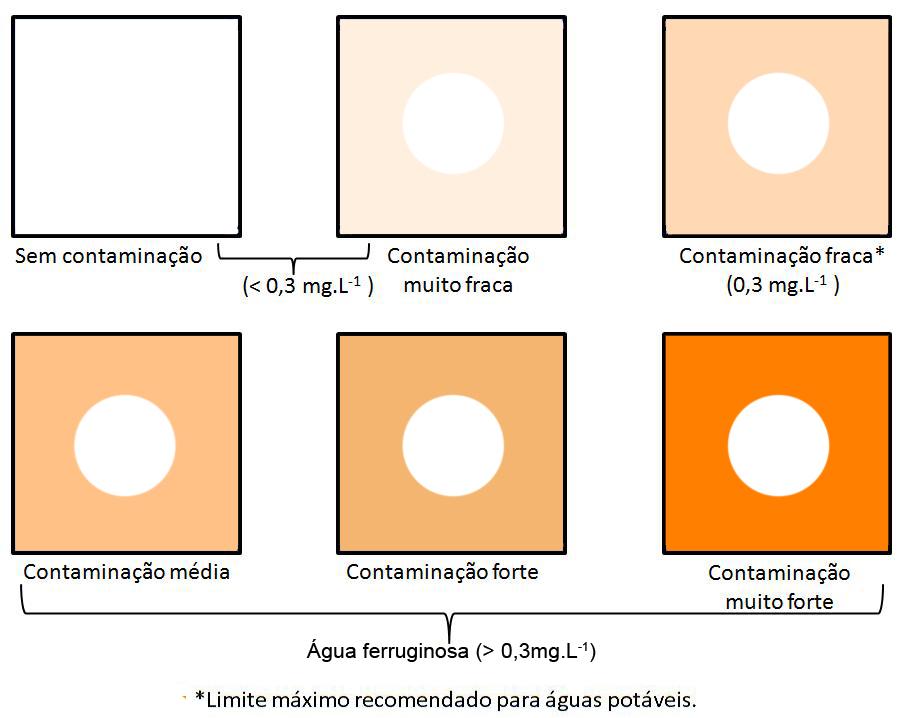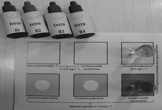 O ferro está freqüentemente presente em águas subterrâneas, o que é favorecido pelas condições de pouca oxigenação dessas águas e redissolução de sedimentos ferruginosos do subsolo, entre outros fatores. As comunidades que consomem águas ferruginosas enfrentam problemas de qualidade de vida e de saúde. O presente artigo apresenta a metodologia para elaboração e manuseio de um kit analítico portátil, simples e de baixo custo, otimizado para a avaliação qualitativa dos níveis de ferro na água subterrânea. Ele se fundamenta na análise do ferro por colorimetria, através do método da ortofenantrolina ferrosa. A adição dos reagentes específicos confere à amostra tonalidades da cor laranja, cada qual associada a um nível de ferro. A partir da comparação da amostra colorida com uma tabela impressa contendo seis diferentes tons, a cor formada na amostra é associada a um nível de contaminação da água. As vantagens do uso desse kit relacionam-se ao seu caráter instantâneo e ao elevado número de análises (100) que podem potencialmente ser executadas com uma unidade do kit. Isso permite sua utilização na elaboração de diagnósticos da qualidade da água, através da avaliação massiva da água subterrânea consumida em comunidades carentes de água potável canalizada. Isso é favorável à adoção de ações caseiras que visem à remoção do ferro (como o uso de filtros e adaptações na caixa d’água), sendo também uma valiosa ferramenta de gestão ambiental em projetos públicos de saneamento.