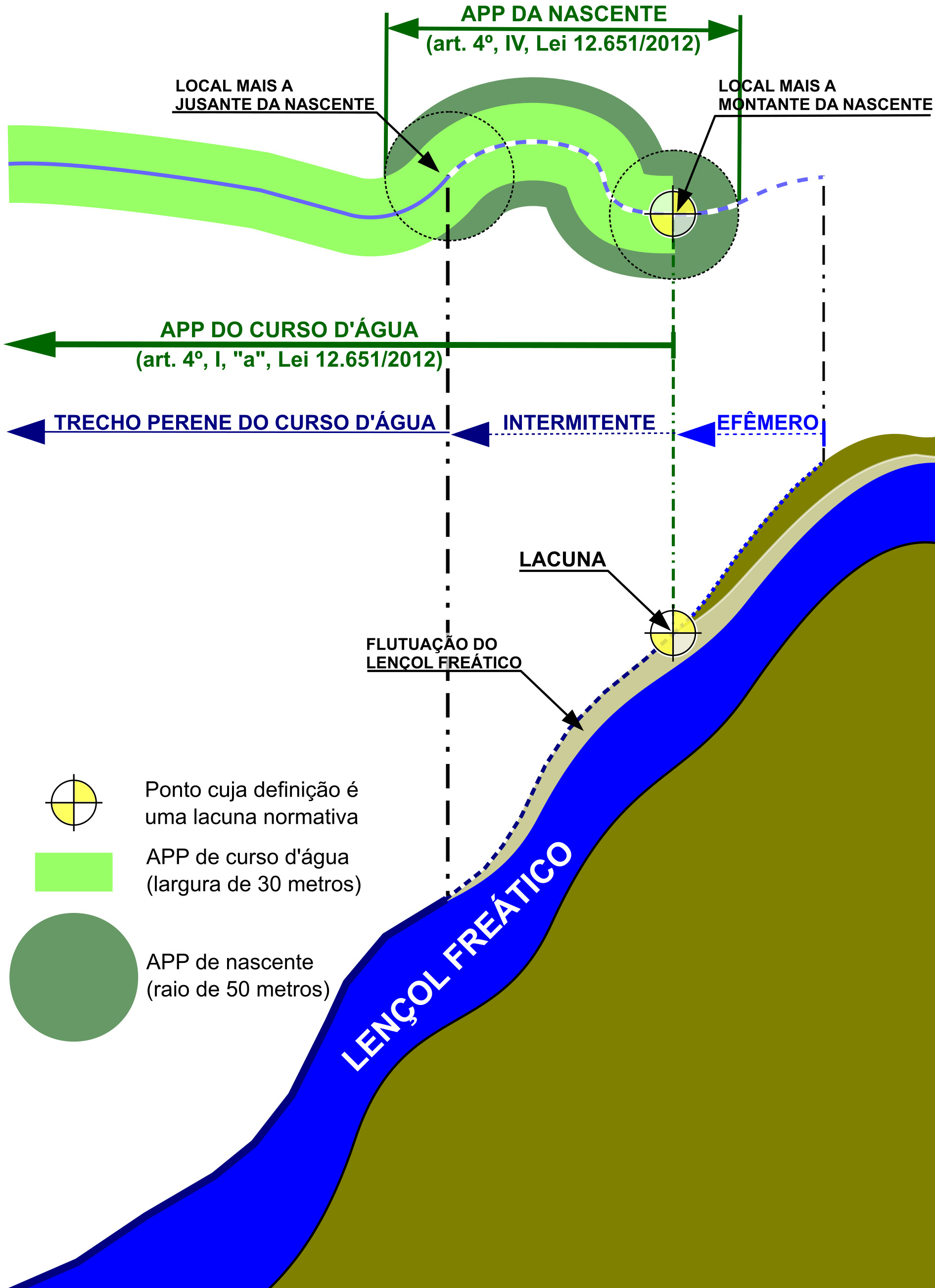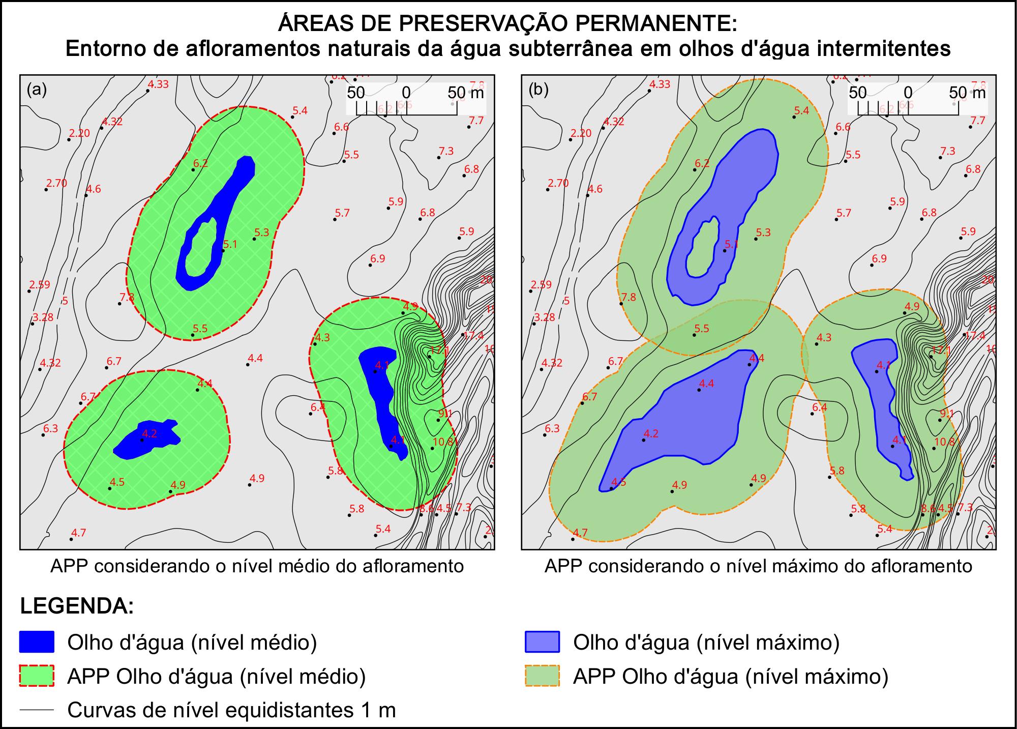 Apesar das nascentes e olhos d’água serem considerados como área de preservação permanente (APP) desde 1965, o legislador por meio da Lei nº 12.651, de 2012, retirou a proteção ambiental dos afloramentos intermitentes. Essa proteção foi restabelecida pelo Supremo Tribunal Federal em fevereiro de 2018. O conhecimento pela comunidade técnico-científica da nova interpretação jurídica fixada para o diagnóstico e proteção destas feições é fundamental para a realização de estudos ambientais. Este artigo apresenta a evolução histórica da legislação de proteção ambiental no entorno de afloramentos de águas subterrâneas no Brasil e suas lacunas técnicas atuais. Por meio de dois exemplos apresenta-se as lacunas na legislação regulatória quanto à delimitação precisa de nascentes e olhos d’água móveis ou sujeitos à variação sazonal de nível. Sem a definição científica clara, a delimitação precisa desta modalidade de APP pode ficar comprometida. Espera-se que o tema incentive trabalhos futuros para investigação de soluções que contribuam para o aperfeiçoamento da proteção e restauração de ecossistemas relacionados com a água.